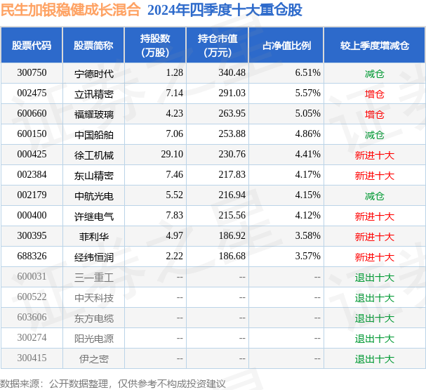 从基金规模来看,民生加银稳健成长混合基金2024年四季度公布的基金规模为0.52亿元,较上一期规模5903.63万元变化了-675.69万元,环比变化了-11.45%。该基金最新一期资产配置为:股票占净值比82.59%,无债券类资产,现金占净值比16.65%。从基金持仓来看,该基金当季前十大股票仓位达45.99%,第一大重仓股为宁德时代(300750),持仓占比为6.51%。