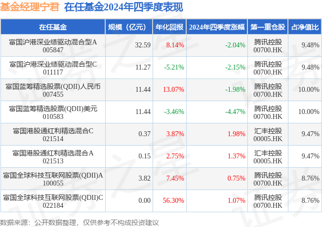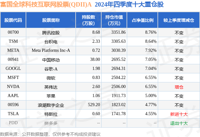 从基金规模来看,富国全球科技互联网股票(QDII)A基金2024年四季度公布的基金规模为3.82亿元,较上一期规模4.03亿元变化了-2048.24万元,环比变化了-5.08%。该基金最新一期资产配置为:股票占净值比74.67%,无债券类资产,现金占净值比10.99%。从基金持仓来看,该基金当季前十大股票仓位达66.83%,第一大重仓股为腾讯控股(00700),持仓占比为8.76%。