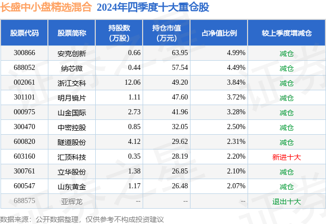 从基金规模来看,长盛中小盘精选混合基金2024年四季度公布的基金规模为0.13亿元,较上一期规模1442.74万元变化了-162.17万元,环比变化了-11.24%。该基金最新一期资产配置为:股票占净值比89.73%,无债券类资产,现金占净值比13.53%。从基金持仓来看,该基金当季前十大股票仓位达31.5%,第一大重仓股为安克创新(300866),持仓占比为4.99%。