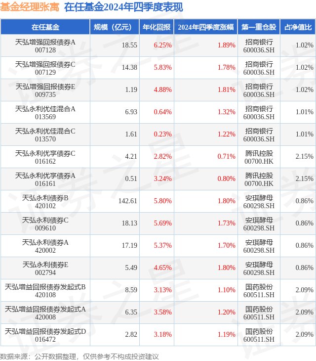 天弘增益回报债券发起式A现任基金经理为张寓 张馨元,近期离任的基金经理为刘洋。其中在任基金经理张寓已从业4年又208天,2021年11月30日正式接手管理天弘增益回报债券发起式A,任职期间累计回报为7.52%。目前还管理着14只基金产品(包括A类和C类),其中本季度表现最佳的基金为天弘增强回报债券A(007128),季度净值涨幅为1.89%。