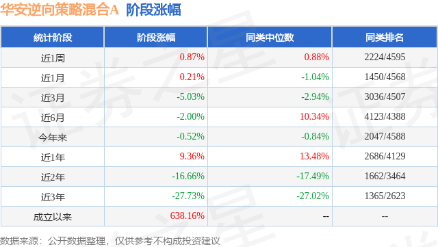 从业绩表现来看,华安逆向策略混合A基金过去一年净值涨幅为9.36%,在同类基金中排名2686/4129,同类基金过去一年净值涨幅中位数为13.48%。而基金过去一年的最大回撤为-13.4%,成立以来的最大回撤为-44.0%。