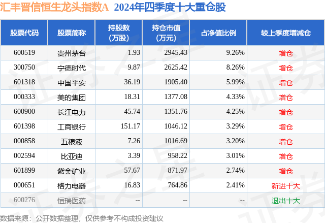 从基金规模来看,汇丰晋信恒生龙头指数A基金2024年四季度公布的基金规模为2.91亿元,较上一期规模2.86亿元变化了499.81万元,环比变化了1.75%。该基金最新一期资产配置为:股票占净值比94.05%,无债券类资产,现金占净值比6.13%。从基金持仓来看,该基金当季前十大股票仓位达46.74%,第一大重仓股为贵州茅台(600519),持仓占比为9.26%。