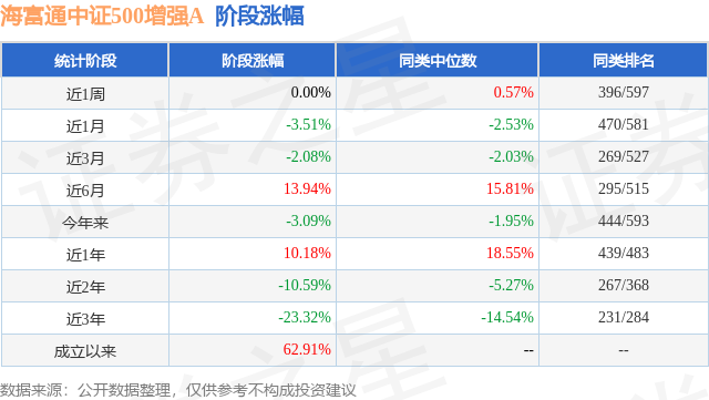 从业绩表现来看,海富通中证500增强A基金过去一年净值涨幅为10.18%,在同类基金中排名439/483,同类基金过去一年净值涨幅中位数为18.55%。而基金过去一年的最大回撤为-17.66%,成立以来的最大回撤为-60.39%。