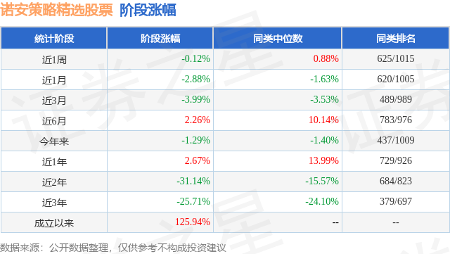 从业绩表现来看,诺安策略精选股票基金过去一年净值涨幅为2.67%,在同类基金中排名729/926,同类基金过去一年净值涨幅中位数为13.99%。而基金过去一年的最大回撤为-21.92%,成立以来的最大回撤为-43.18%。