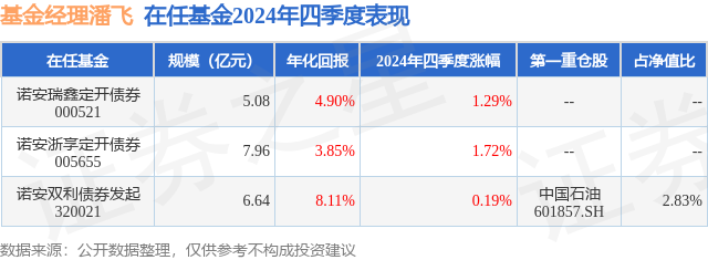 证券之星消息,日前诺安双利债券发起基金公布四季报,2024年四季度最新规模6.64亿元,季度净值涨幅为0.19%。