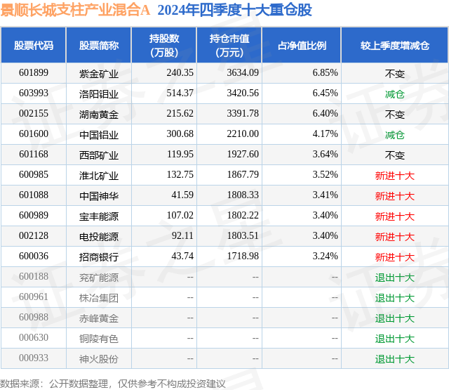 从基金规模来看,景顺长城支柱产业混合A基金2024年四季度公布的基金规模为4.5亿元,较上一期规模5.94亿元变化了-1.44亿元,环比变化了-24.23%。该基金最新一期资产配置为:股票占净值比85.16%,债券占净值比6.69%,现金占净值比11.0%。从基金持仓来看,该基金当季前十大股票仓位达44.48%,第一大重仓股为紫金矿业(601899),持仓占比为6.85%。