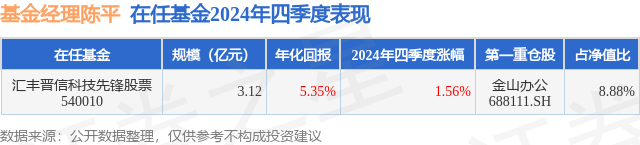 证券之星消息,日前汇丰晋信科技先锋股票基金公布四季报,2024年四季度最新规模3.12亿元,季度净值涨幅为1.56%。