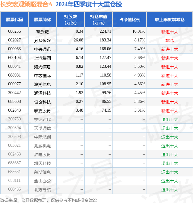 从基金规模来看,长安宏观策略混合A基金2024年四季度公布的基金规模为0.21亿元,较上一期规模2473.78万元变化了-393.69万元,环比变化了-15.91%。该基金最新一期资产配置为:股票占净值比81.26%,无债券类资产,现金占净值比20.18%。从基金持仓来看,该基金当季前十大股票仓位达58.26%,第一大重仓股为寒武纪(688256),持仓占比为10.01%。