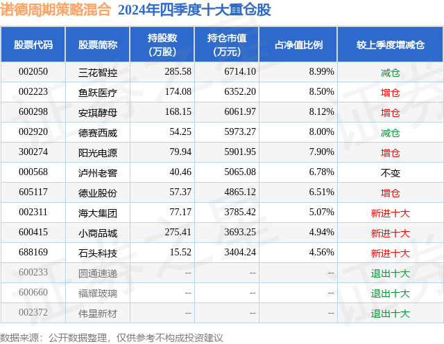 从基金规模来看,诺德周期策略混合基金2024年四季度公布的基金规模为7.47亿元,较上一期规模8.07亿元变化了-6042.34万元,环比变化了-7.48%。该基金最新一期资产配置为:股票占净值比93.38%,无债券类资产,现金占净值比6.37%。从基金持仓来看,该基金当季前十大股票仓位达69.37%,第一大重仓股为三花智控(002050),持仓占比为8.99%。