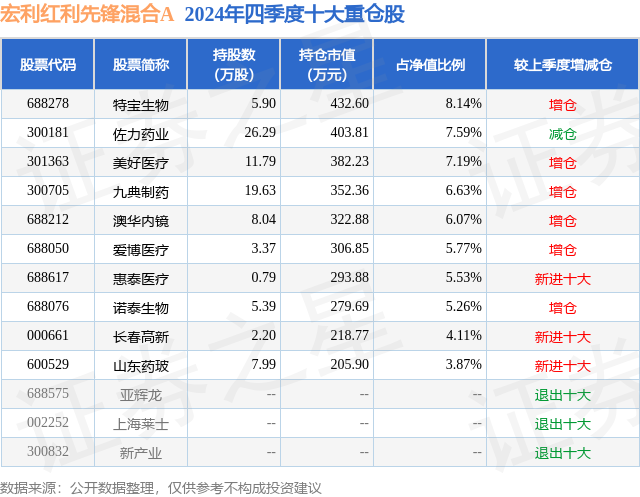 从基金规模来看,宏利红利先锋混合A基金2024年四季度公布的基金规模为0.51亿元,较上一期规模6060.2万元变化了-922.93万元,环比变化了-15.23%。该基金最新一期资产配置为:股票占净值比93.25%,无债券类资产,现金占净值比6.4%。从基金持仓来看,该基金当季前十大股票仓位达60.16%,第一大重仓股为特宝生物(688278),持仓占比为8.14%。