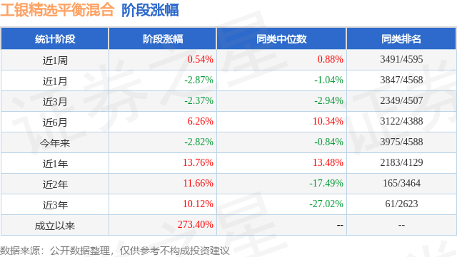 从业绩表现来看,工银精选平衡混合基金过去一年净值涨幅为13.76%,在同类基金中排名2183/4129,同类基金过去一年净值涨幅中位数为13.48%。而基金过去一年的最大回撤为-9.09%,成立以来的最大回撤为-59.93%。