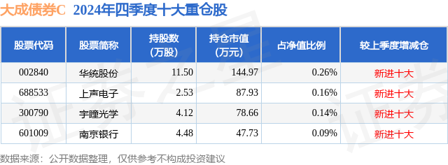 从基金规模来看,大成债券C基金2024年四季度公布的基金规模为0.8亿元,较上一期规模8318.13万元变化了-347.57万元,环比变化了-4.18%。该基金最新一期资产配置为:股票占净值比0.65%,债券占净值比121.47%,现金占净值比1.23%。从基金持仓来看,该基金当季前十大股票仓位达0.65%,第一大重仓股为华统股份(002840),持仓占比为0.26%。