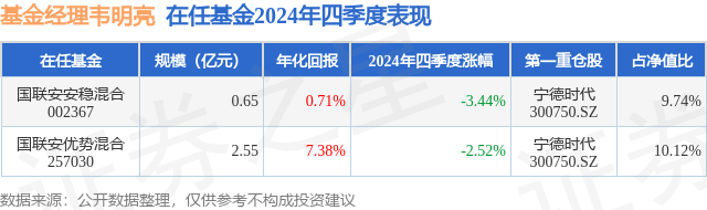 从基金规模来看,国联安优势混合基金2024年四季度公布的基金规模为2.55亿元,较上一期规模2.74亿元变化了-1916.44万元,环比变化了-6.99%。该基金最新一期资产配置为:股票占净值比84.87%,无债券类资产,现金占净值比15.36%。从基金持仓来看,该基金当季前十大股票仓位达60.61%,第一大重仓股为宁德时代(300750),持仓占比为10.12%。