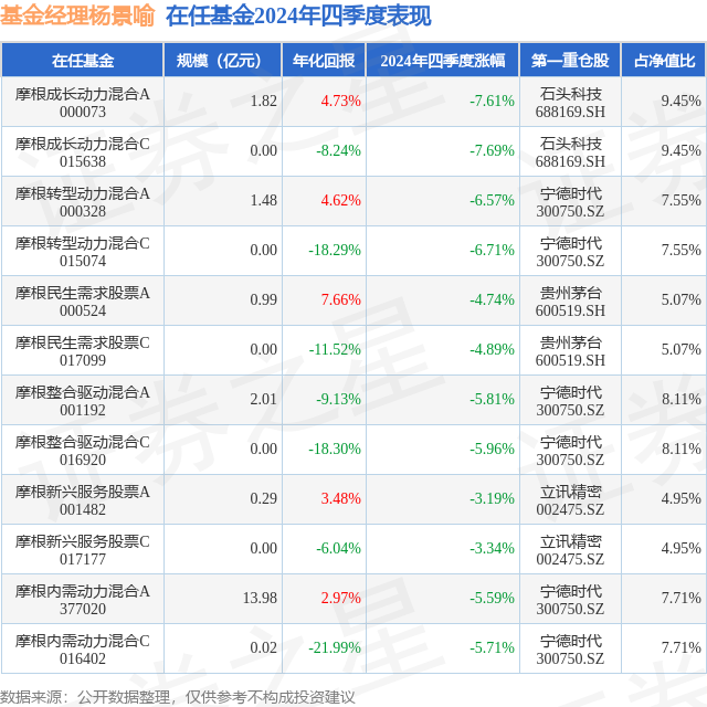 从基金规模来看,摩根内需动力混合A基金2024年四季度公布的基金规模为13.98亿元,较上一期规模14.99亿元变化了-1.01亿元,环比变化了-6.76%。该基金最新一期资产配置为:股票占净值比89.53%,债券占净值比0.06%,现金占净值比10.7%。从基金持仓来看,该基金当季前十大股票仓位达33.66%,第一大重仓股为宁德时代(300750),持仓占比为7.71%。