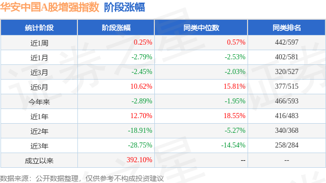 从业绩表现来看,华安中国A股增强指数基金过去一年净值涨幅为12.7%,在同类基金中排名416/483,同类基金过去一年净值涨幅中位数为18.55%。而基金过去一年的最大回撤为-15.78%,成立以来的最大回撤为-69.76%。
