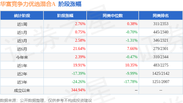 从业绩表现来看,华富竞争力优选混合A基金过去一年净值涨幅为19.91%,在同类基金中排名483/2275,同类基金过去一年净值涨幅中位数为10.35%。而基金过去一年的最大回撤为-23.06%,成立以来的最大回撤为-71.01%。