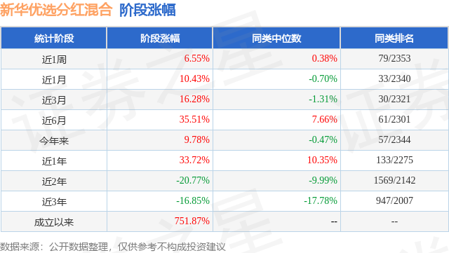 从业绩表现来看,新华优选分红混合基金过去一年净值涨幅为33.72%,在同类基金中排名133/2275,同类基金过去一年净值涨幅中位数为10.35%。而基金过去一年的最大回撤为-32.31%,成立以来的最大回撤为-66.49%。