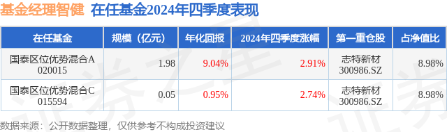 从基金规模来看,国泰区位优势混合A基金2024年四季度公布的基金规模为1.98亿元,较上一期规模1.91亿元变化了708.95万元,环比变化了3.71%。该基金最新一期资产配置为:股票占净值比93.13%,债券占净值比5.87%,现金占净值比3.68%。从基金持仓来看,该基金当季前十大股票仓位达67.75%,第一大重仓股为志特新材(300986),持仓占比为8.98%。