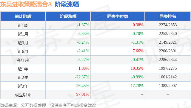 从业绩表现来看,东吴进取策略混合A基金过去一年净值涨幅为1.08%,在同类基金中排名1997/2275,同类基金过去一年净值涨幅中位数为10.35%。而基金过去一年的最大回撤为-15.64%,成立以来的最大回撤为-59.08%。