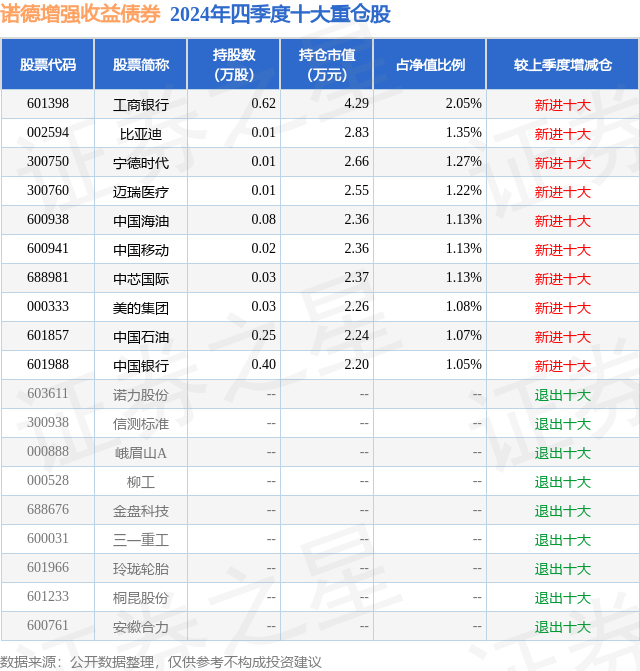 从基金规模来看,诺德增强收益债券基金2024年四季度公布的基金规模为0.02亿元,较上一期规模257.07万元变化了-47.59万元,环比变化了-18.51%。该基金最新一期资产配置为:股票占净值比18.42%,债券占净值比83.63%,现金占净值比0.58%。从基金持仓来看,该基金当季前十大股票仓位达12.48%,第一大重仓股为工商银行(601398),持仓占比为2.05%。