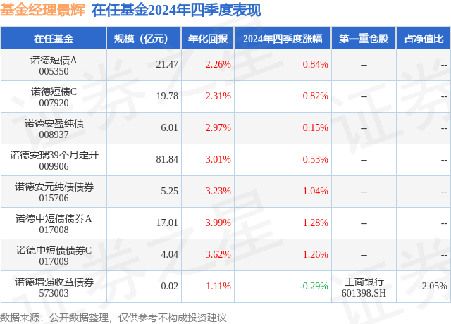 诺德增强收益债券现任基金经理为景辉,近期离任的基金经理为徐娟。其中在任基金经理景辉已从业6年又218天,2018年6月22日正式接手管理诺德增强收益债券,任职期间累计回报为8.98%。目前还管理着8只基金产品(包括A类和C类),其中本季度表现最佳的基金为诺德中短债债券A(017008),季度净值涨幅为1.28%。