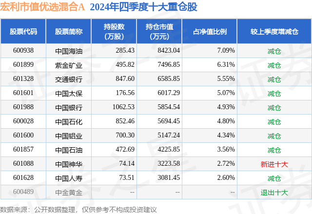 从基金规模来看,宏利市值优选混合A基金2024年四季度公布的基金规模为11.37亿元,较上一期规模14.08亿元变化了-2.71亿元,环比变化了-19.24%。该基金最新一期资产配置为:股票占净值比85.44%,无债券类资产,现金占净值比14.8%。从基金持仓来看,该基金当季前十大股票仓位达46.97%,第一大重仓股为中国海油(600938),持仓占比为7.09%。