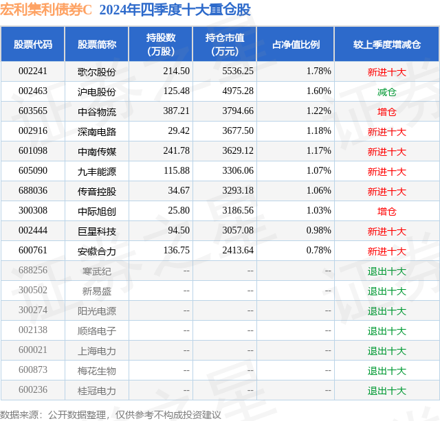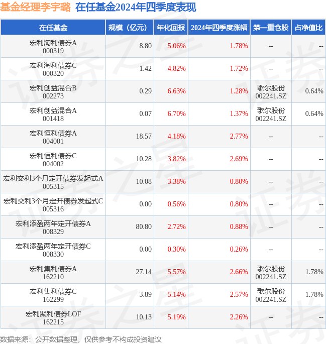 从基金规模来看,宏利集利债券C基金2024年四季度公布的基金规模为3.89亿元,较上一期规模2.69亿元变化了1.21亿元,环比变化了44.97%。该基金最新一期资产配置为:股票占净值比16.63%,债券占净值比93.2%,现金占净值比1.86%。从基金持仓来看,该基金当季前十大股票仓位达11.87%,第一大重仓股为歌尔股份(002241),持仓占比为1.78%。