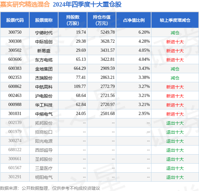 从基金规模来看,嘉实研究精选混合基金2024年四季度公布的基金规模为8.47亿元,较上一期规模9.28亿元变化了-8038.79万元,环比变化了-8.67%。该基金最新一期资产配置为:股票占净值比92.61%,无债券类资产,现金占净值比7.72%。从基金持仓来看,该基金当季前十大股票仓位达38.02%,第一大重仓股为宁德时代(300750),持仓占比为6.2%。