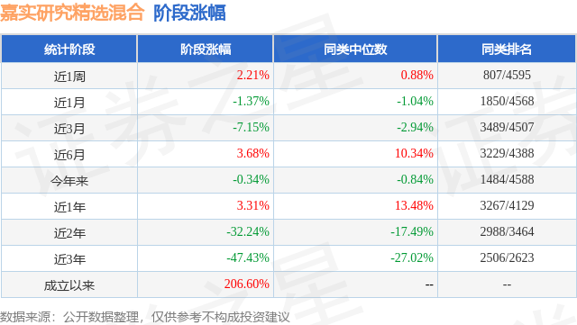 从业绩表现来看,嘉实研究精选混合基金过去一年净值涨幅为3.31%,在同类基金中排名3267/4129,同类基金过去一年净值涨幅中位数为13.48%。而基金过去一年的最大回撤为-19.97%,成立以来的最大回撤为-62.51%。