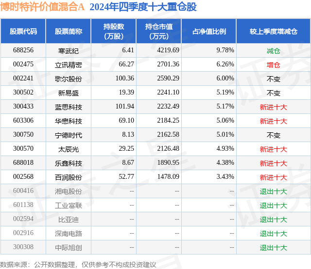 从基金规模来看,博时特许价值混合A基金2024年四季度公布的基金规模为4.32亿元,较上一期规模4.03亿元变化了2905.05万元,环比变化了7.22%。该基金最新一期资产配置为:股票占净值比90.41%,债券占净值比3.78%,现金占净值比6.24%。从基金持仓来看,该基金当季前十大股票仓位达55.21%,第一大重仓股为寒武纪(688256),持仓占比为9.78%。