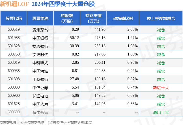 从基金规模来看,新机遇LOF基金2024年四季度公布的基金规模为0.51亿元,较上一期规模6747.59万元变化了-1684.62万元,环比变化了-24.97%。该基金最新一期资产配置为:股票占净值比31.23%,债券占净值比57.38%,现金占净值比5.1%。从基金持仓来看,该基金当季前十大股票仓位达10.21%,第一大重仓股为贵州茅台(600519),持仓占比为2.03%。