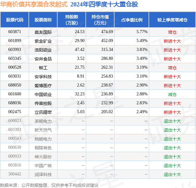 从基金规模来看,华商价值共享混合发起式基金2024年四季度公布的基金规模为0.82亿元,较上一期规模8653.23万元变化了-424.92万元,环比变化了-4.91%。该基金最新一期资产配置为:股票占净值比84.08%,无债券类资产,现金占净值比18.65%。从基金持仓来看,该基金当季前十大股票仓位达35.97%,第一大重仓股为嘉友国际(603871),持仓占比为5.77%。