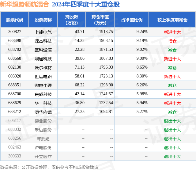 从基金规模来看,新华趋势领航混合基金2024年四季度公布的基金规模为2.08亿元,较上一期规模2.21亿元变化了-1326.41万元,环比变化了-6.01%。该基金最新一期资产配置为:股票占净值比92.57%,债券占净值比2.14%,现金占净值比5.65%。从基金持仓来看,该基金当季前十大股票仓位达76.85%,第一大重仓股为上能电气(300827),持仓占比为9.24%。
