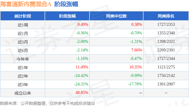 从业绩表现来看,海富通新内需混合A基金过去一年净值涨幅为11.49%,在同类基金中排名1121/2275,同类基金过去一年净值涨幅中位数为10.35%。而基金过去一年的最大回撤为-15.77%,成立以来的最大回撤为-50.72%。