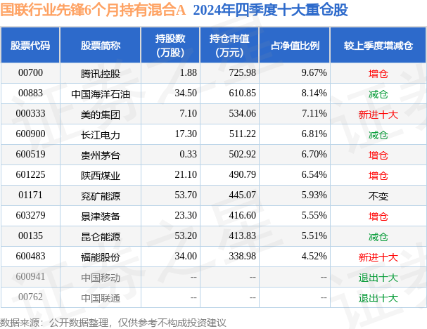 从基金规模来看,国联行业先锋6个月持有混合A基金2024年四季度公布的基金规模为0.73亿元,较上一期规模8763.1万元变化了-1489.56万元,环比变化了-17.0%。该基金最新一期资产配置为:股票占净值比82.33%,债券占净值比6.11%,现金占净值比4.55%。从基金持仓来看,该基金当季前十大股票仓位达66.48%,第一大重仓股为腾讯控股(00700),持仓占比为9.67%。