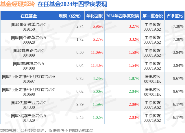 国联行业先锋6个月持有混合A现任基金经理为郑玲。其中在任基金经理郑玲已从业3年又308天,2024年4月26日正式接手管理国联行业先锋6个月持有混合A,任职期间累计回报为4.7%。目前还管理着8只基金产品(包括A类和C类),其中本季度表现最佳的基金为国联国企改革混合A(000928),季度净值涨幅为3.32%。