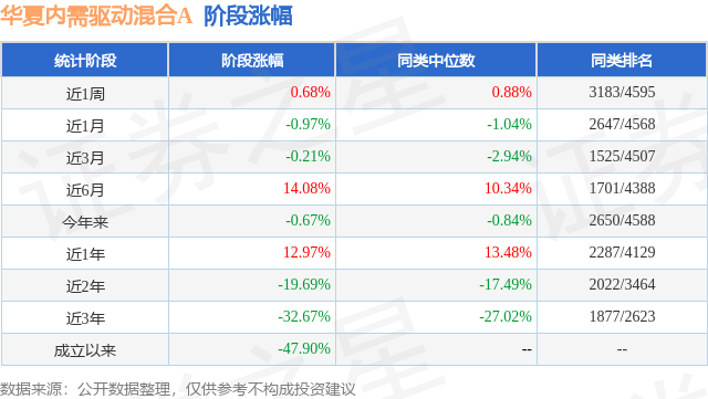 从业绩表现来看,华夏内需驱动混合A基金过去一年净值涨幅为12.97%,在同类基金中排名2287/4129,同类基金过去一年净值涨幅中位数为13.48%。而基金过去一年的最大回撤为-17.73%,成立以来的最大回撤为-57.98%。