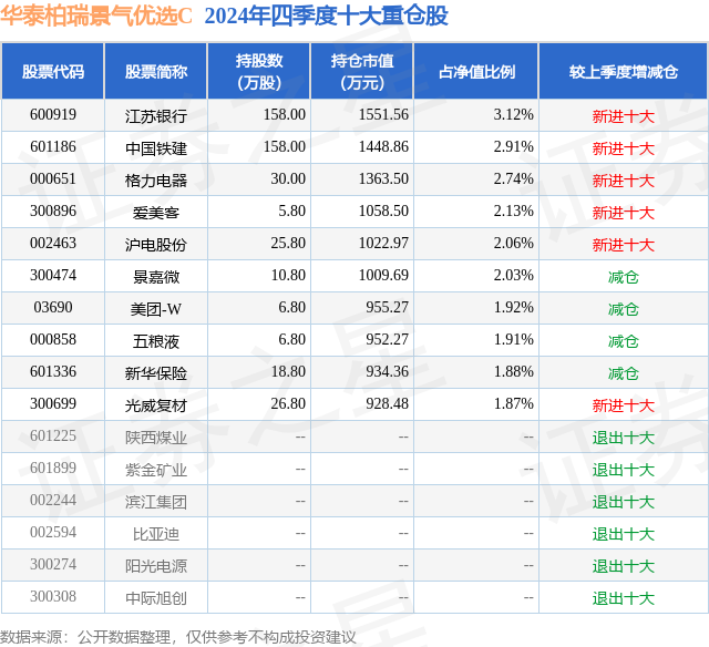 从基金规模来看,华泰柏瑞景气优选C基金2024年四季度公布的基金规模为0.01亿元,较上一期规模122.77万元变化了-19.88万元,环比变化了-16.19%。该基金最新一期资产配置为:股票占净值比79.39%,无债券类资产,现金占净值比21.64%。从基金持仓来看,该基金当季前十大股票仓位达22.57%,第一大重仓股为江苏银行(600919),持仓占比为3.12%。