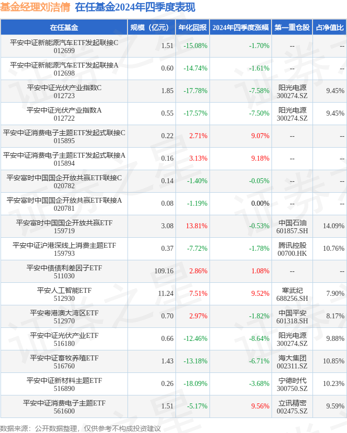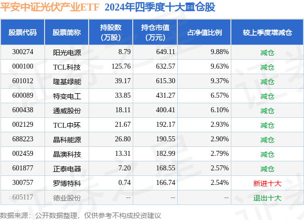 证券之星消息,日前平安中证光伏产业ETF基金公布四季报,2024年四季度最新规模0.66亿元,季度净值涨幅为-8.64%。