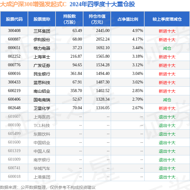 从基金规模来看,大成沪深300增强发起式C基金2024年四季度公布的基金规模为1.79亿元,较上一期规模3.04亿元变化了-1.25亿元,环比变化了-41.26%。该基金最新一期资产配置为:股票占净值比93.53%,无债券类资产,现金占净值比6.57%。从基金持仓来看,该基金当季前十大股票仓位达33.16%,第一大重仓股为三环集团(300408),持仓占比为4.97%。