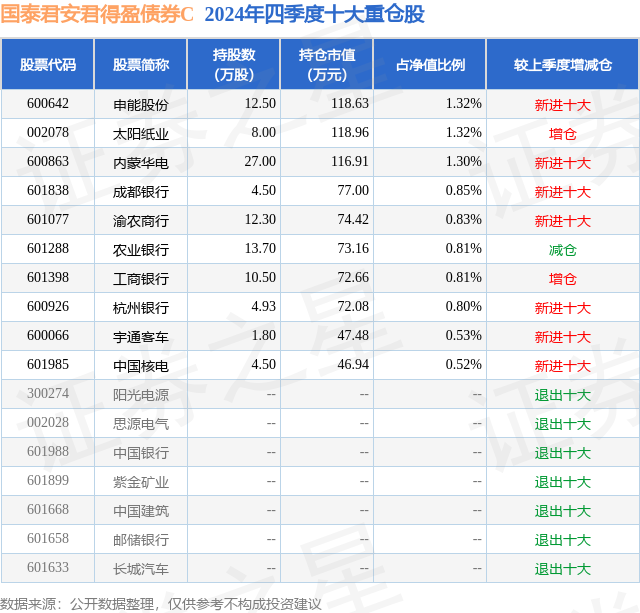 从基金规模来看,国泰君安君得盈债券C基金2024年四季度公布的基金规模为0.41亿元,较上一期规模4447.22万元变化了-366.6万元,环比变化了-8.24%。该基金最新一期资产配置为:股票占净值比19.37%,债券占净值比97.31%,现金占净值比3.15%。从基金持仓来看,该基金当季前十大股票仓位达9.09%,第一大重仓股为申能股份(600642),持仓占比为1.32%。