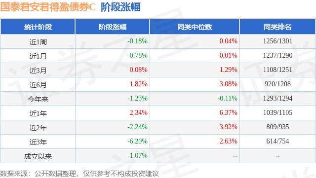从业绩表现来看,国泰君安君得盈债券C基金过去一年净值涨幅为2.34%,在同类基金中排名1039/1105,同类基金过去一年净值涨幅中位数为6.37%。而基金过去一年的最大回撤为-2.79%,成立以来的最大回撤为-10.67%。