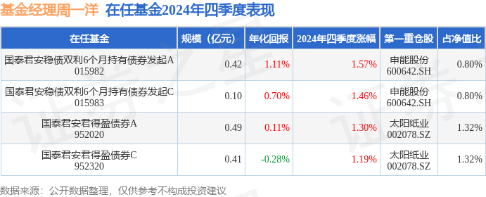 国泰君安君得盈债券C现任基金经理为周一洋 杨勇。其中在任基金经理周一洋已从业2年又72天,2022年11月14日正式接手管理国泰君安君得盈债券C,任职期间累计回报为-1.87%。目前还管理着4只基金产品(包括A类和C类),其中本季度表现最佳的基金为国泰君安稳债双利6个月持有债券发起A(015982),季度净值涨幅为1.57%。