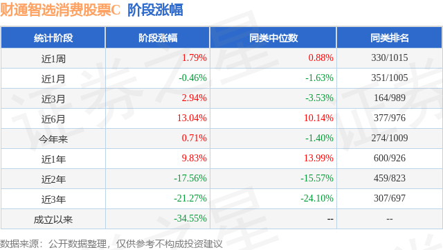 从业绩表现来看,财通智选消费股票C基金过去一年净值涨幅为9.83%,在同类基金中排名600/926,同类基金过去一年净值涨幅中位数为13.99%。而基金过去一年的最大回撤为-22.79%,成立以来的最大回撤为-48.7%。