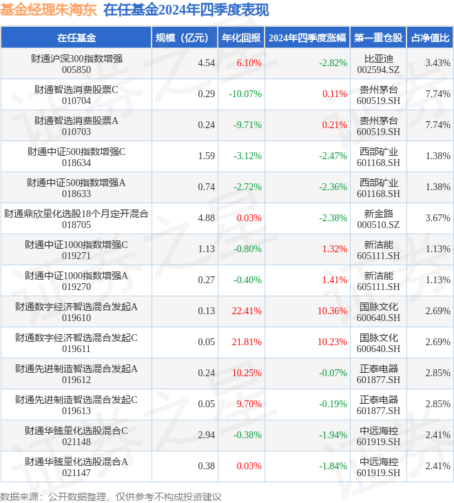 财通智选消费股票C现任基金经理为朱海东 顾弘原 郭欣。其中在任基金经理朱海东已从业5年又194天,2021年1月27日正式接手管理财通智选消费股票C,任职期间累计回报为-34.31%。目前还管理着14只基金产品(包括A类和C类),其中本季度表现最佳的基金为财通数字经济智选混合发起A(019610),季度净值涨幅为10.36%。