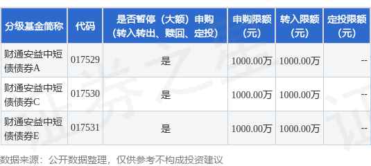 证券之星消息,1月24日财通基金管理有限公司发布《关于财通安益中短债债券型证券投资基金暂停大额申购、定期定额投资及转换转入业务的公告》。公告中提示,为了保证基金的平稳运作,保护基金份额持有人利益,自2025年1月27日起财通安益中短债债券型证券投资基金暂停大额申购、定期定额投资及转换转入业务,申购、转换转入上限金额为1000.0万元,下属分级基金调整明细如下: