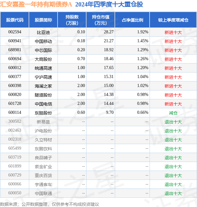 从基金规模来看,汇安嘉盈一年持有期债券A基金2024年四季度公布的基金规模为0.08亿元,较上一期规模851.58万元变化了-20.16万元,环比变化了-2.37%。该基金最新一期资产配置为:股票占净值比19.75%,债券占净值比85.65%,现金占净值比2.03%。从基金持仓来看,该基金当季前十大股票仓位达11.8%,第一大重仓股为比亚迪(002594),持仓占比为1.92%。