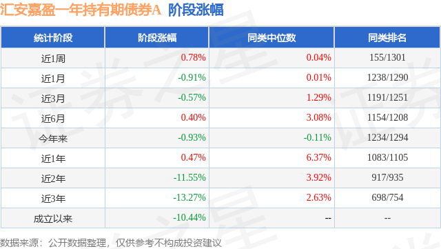 从业绩表现来看,汇安嘉盈一年持有期债券A基金过去一年净值涨幅为0.47%,在同类基金中排名1083/1105,同类基金过去一年净值涨幅中位数为6.37%。而基金过去一年的最大回撤为-5.14%,成立以来的最大回撤为-17.78%。