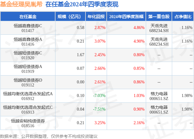 证券之星消息,日前恒越嘉鑫债券A基金公布四季报,2024年四季度最新规模0.21亿元,季度净值涨幅为4.9%。