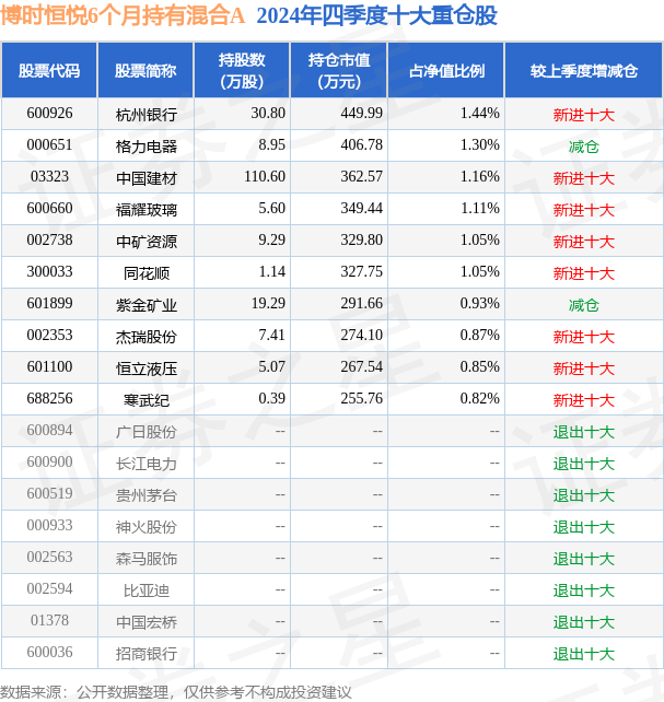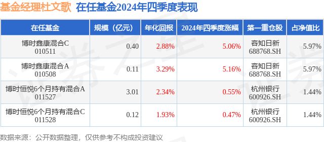从基金规模来看,博时恒悦6个月持有混合A基金2024年四季度公布的基金规模为3.01亿元,较上一期规模3.82亿元变化了-8095.92万元,环比变化了-21.17%。该基金最新一期资产配置为:股票占净值比18.49%,债券占净值比105.99%,现金占净值比4.53%。从基金持仓来看,该基金当季前十大股票仓位达10.58%,第一大重仓股为杭州银行(600926),持仓占比为1.44%。